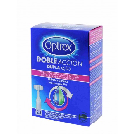 El producto OPTREX Doble Acción Colirio para Ojos Secos en formato de 20 monodosis es un colirio cómodo de aplicar, que permite mantener la calidad del producto en condiciones óptimas durante más tiempo. Con su doble acción hidratante y lubricante, proporciona un alivio inmediato y duradero para la sequedad ocular. Ayuda a restablecer los niveles de hidratación natural de los ojos, ofreciendo un alivio instantáneo y prolongado.